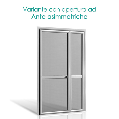 * in questa zanzariera c’è la possibilità di inserire nella parte inferiore di una delle due ante una gattaiola per facilitare l’accesso di animali domestici (contattaci e richiedi un preventivo). In caso di scelta di questo modello consigliamo di inserire nella parte inferiore del pannello, o su tutta la zanzariera, la rete rinforzata “Pet screen”.